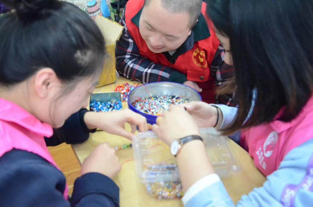 同时带领孩子们一起做手工,用串珠穿连爱心挂件,乐趣无穷。此外,现场还为小伙伴们端送义工们亲手包的爱心水饺,欢声笑语中传递着彼此之间真诚的温暖。