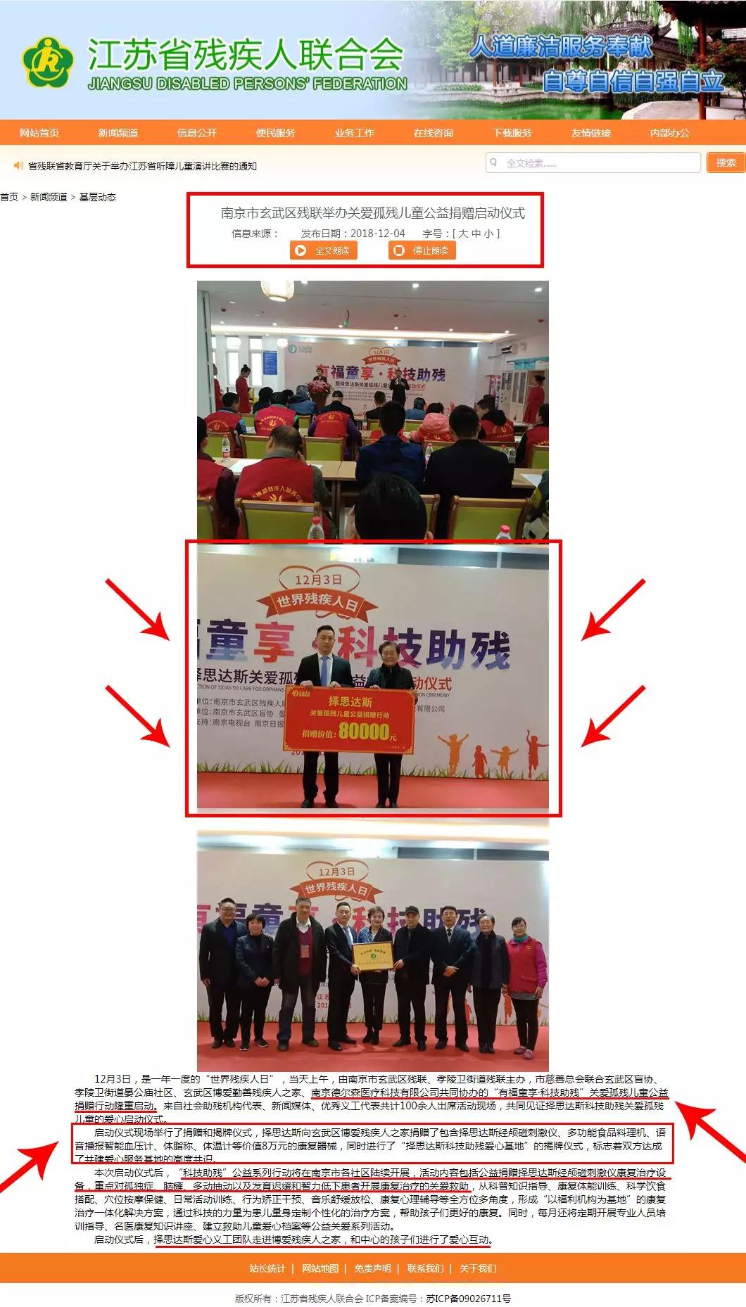 2018年12月4日,江苏省残疾人联合会官网《新闻频道》之〖基层动态〗栏目,重点报道了我司旗下择思达斯“科技助残”公益捐赠启动仪式。在此,我司特别鸣谢江苏省残联以及玄武区残联对择思达斯公益活动的全程指导与关心支持,践行公益的路上,择思达斯定当再接再厉,初心再出发!